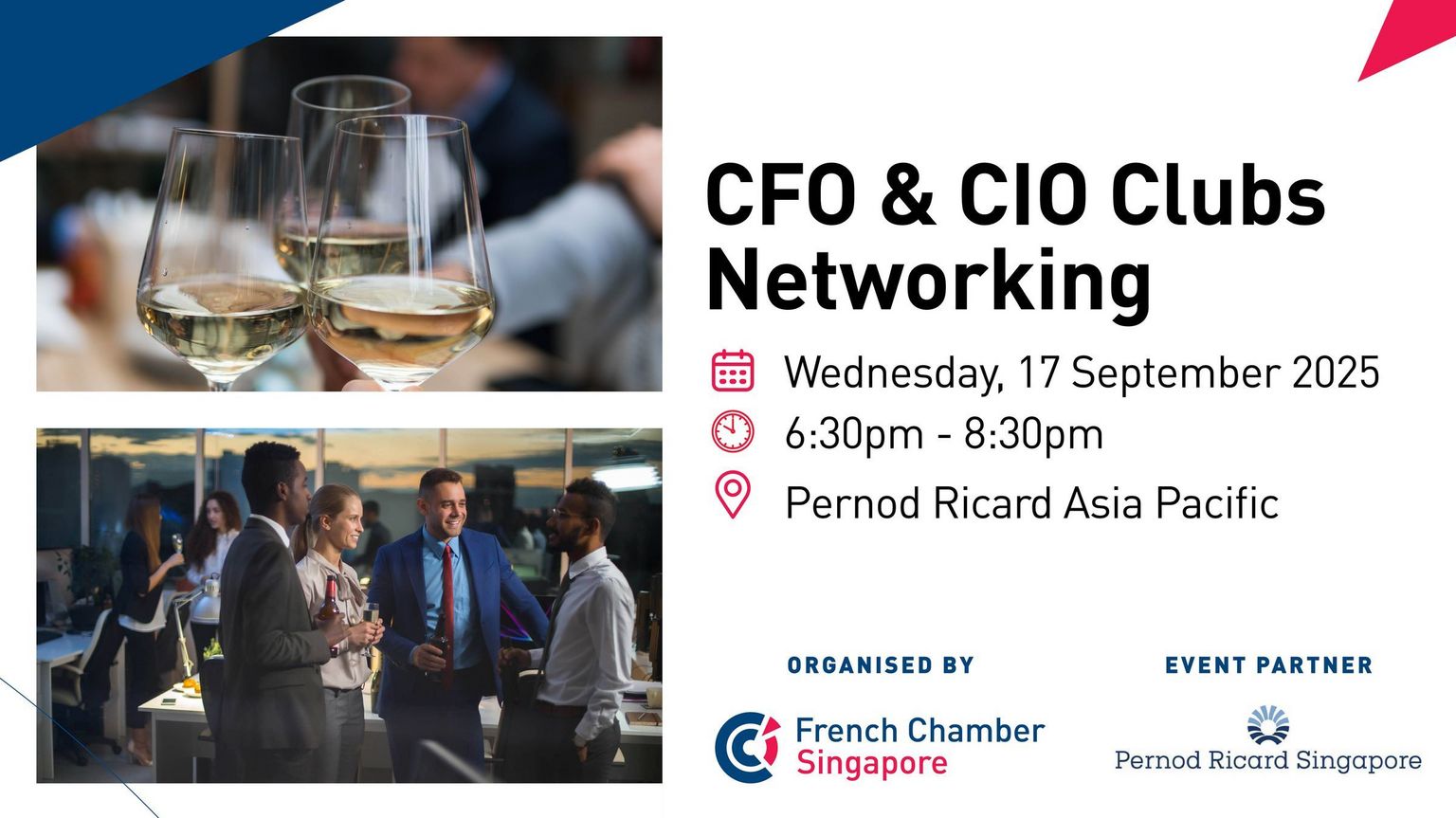 The French Chamber of Commerce, in collaboration with Pernod Ricard Singapore, is delighted to host a special networking cocktail for CFOs and CIOs.