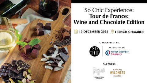 Embark on a refined sensory journey across France without leaving Singapore. This exclusive So Chic Experience invites you to explore the richness of eight major French Wine Regions, expertly curated by Artisan & Terroirs. Each selected wine will be perfectly paired with exquisite creations from Organic Wildness Chocolate, which uses only organic cocoas specifically designed for the ultimate pairing experience.