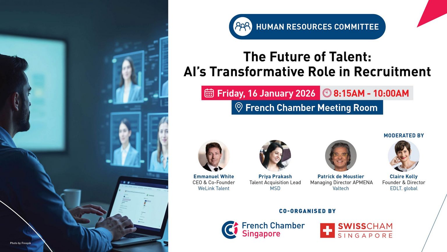 This panel discussion, co-organised with the SwissCham, will delve into the practical and strategic implications of AI across the recruitment lifecycle—from sourcing and screening to candidate engagement, skills evaluation, and workforce planning.