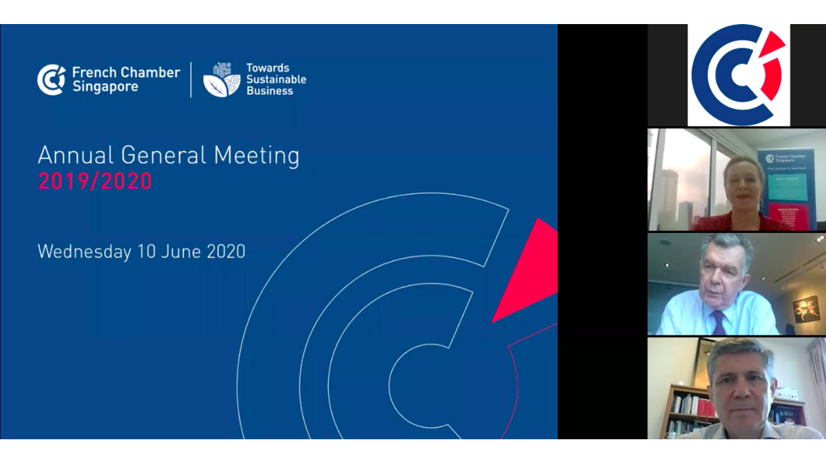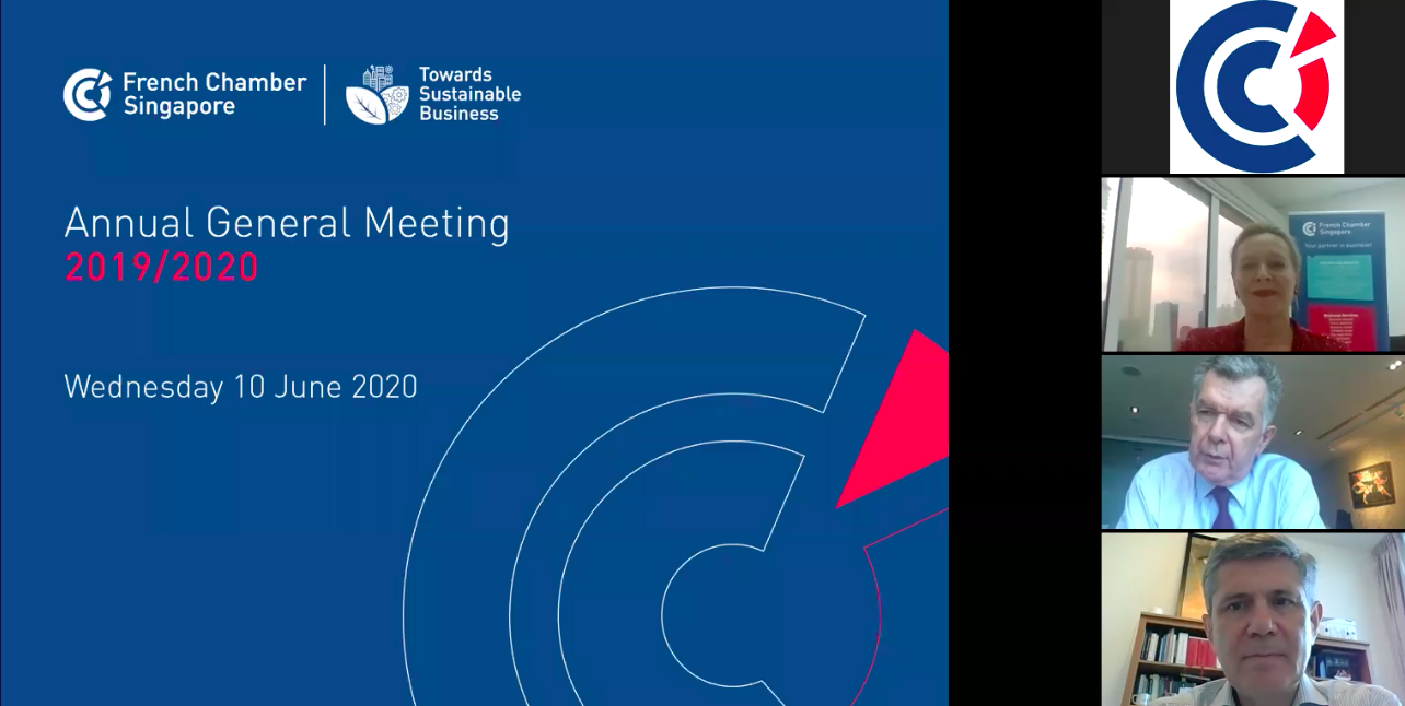The Annual General Meeting 2020 was held online this year, in lieu of the coronavirus circuit breaker measures. The opening remarks were given by Pascal Lambert, President, followed by a presentation of the Chamber's activities from Carine Lespeyandel, Executive Director, and a budget report by Stéphane Thierry, Treasurer. The agenda was as follows: