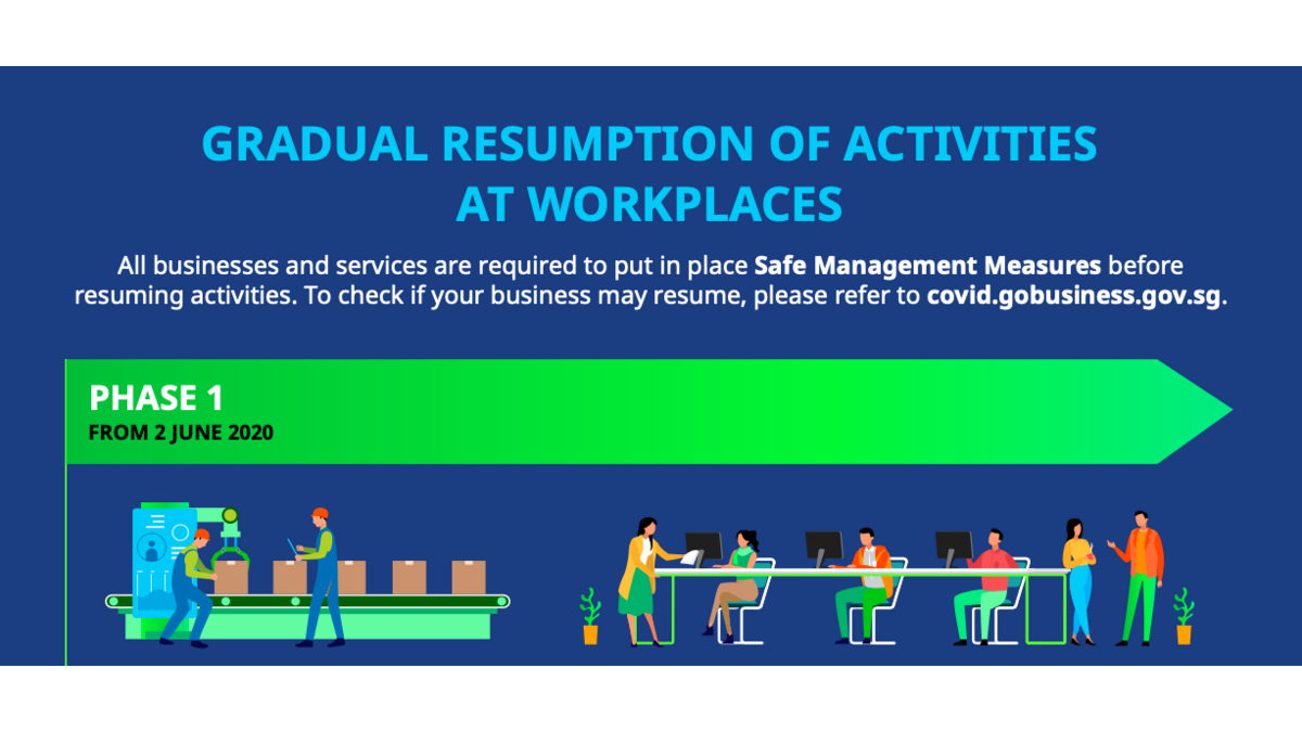 - Gradual resumption of more activities and businesses will be allowed subject to safe management measures being implemented and practised by employers and employees in these workplaces and their ability to also maintain a safe environment for their customers.