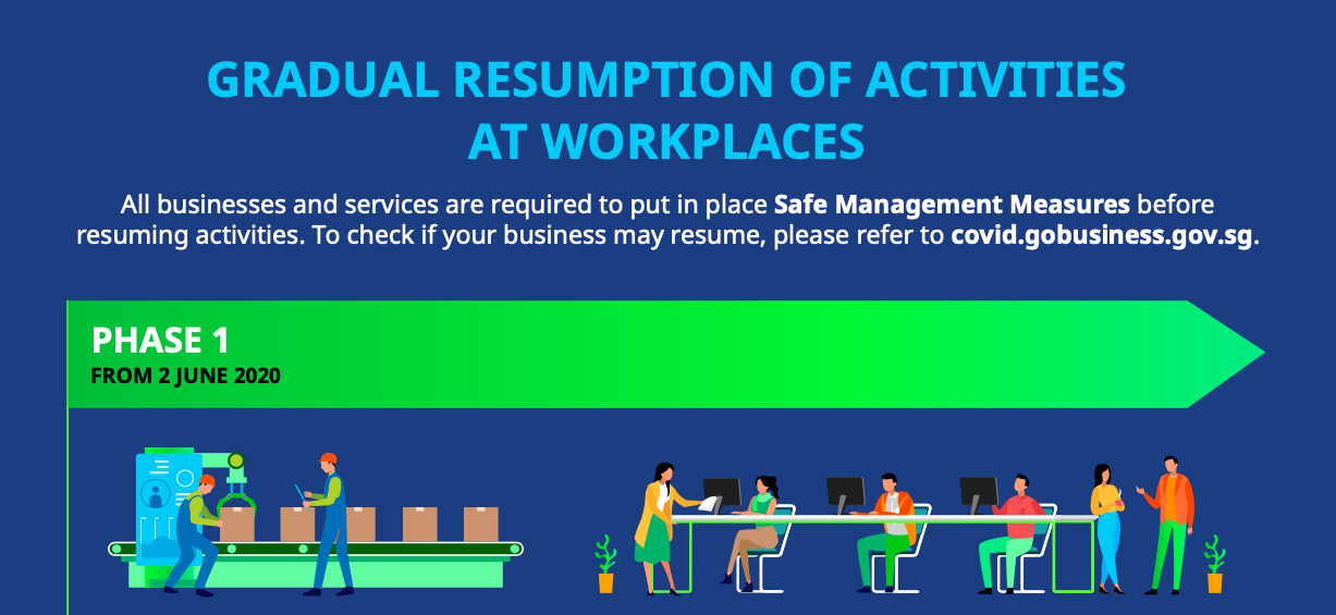 As announced by the Multi-Ministry Taskforce on 19 May 2020, Circuit Breaker measures will be gradually eased from 2 June 2020, and businesses will be allowed to resume activities in the phased banner. (See MTI’s press release below)