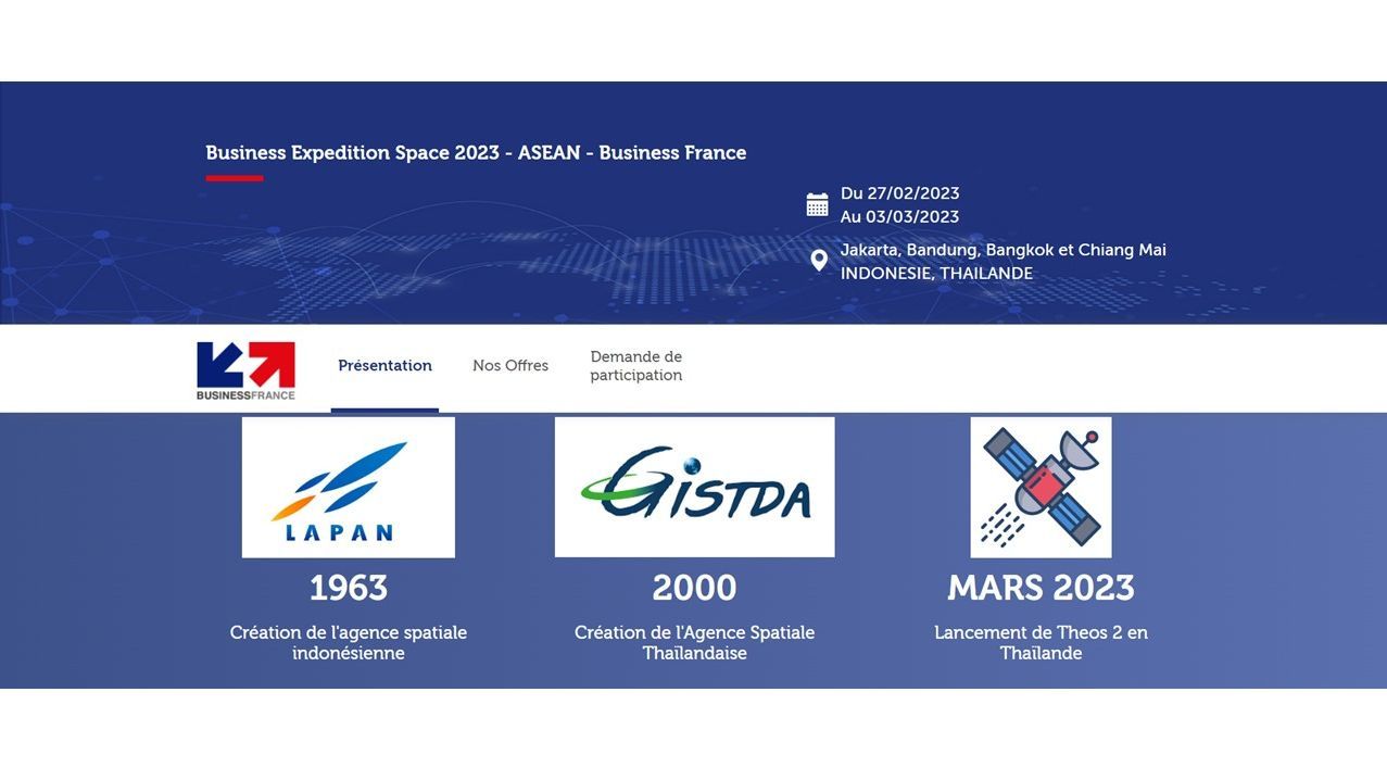 Profitant d'un contexte riche et favorable, lié notamment à l'année de l'innovation France/Thaïlande et au lancement du satellite THEOS-2 début 2023, Business France vous propose de venir rencontrer les décideurs et les acteurs clefs du secteur spatial en Thaïlande et en Indonésie lors d’une mission de découverte et ainsi positionner votre offre sur ces marchés en fort développement.