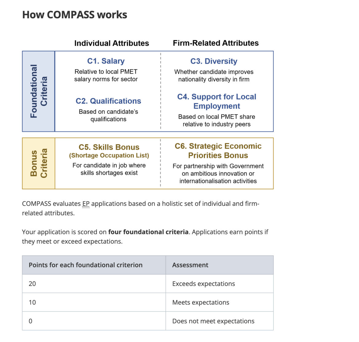 In addition to meeting the qualifying salary, EP candidates must pass a points-based Complementarity Assessment Framework (COMPASS) from 1 September 2023.