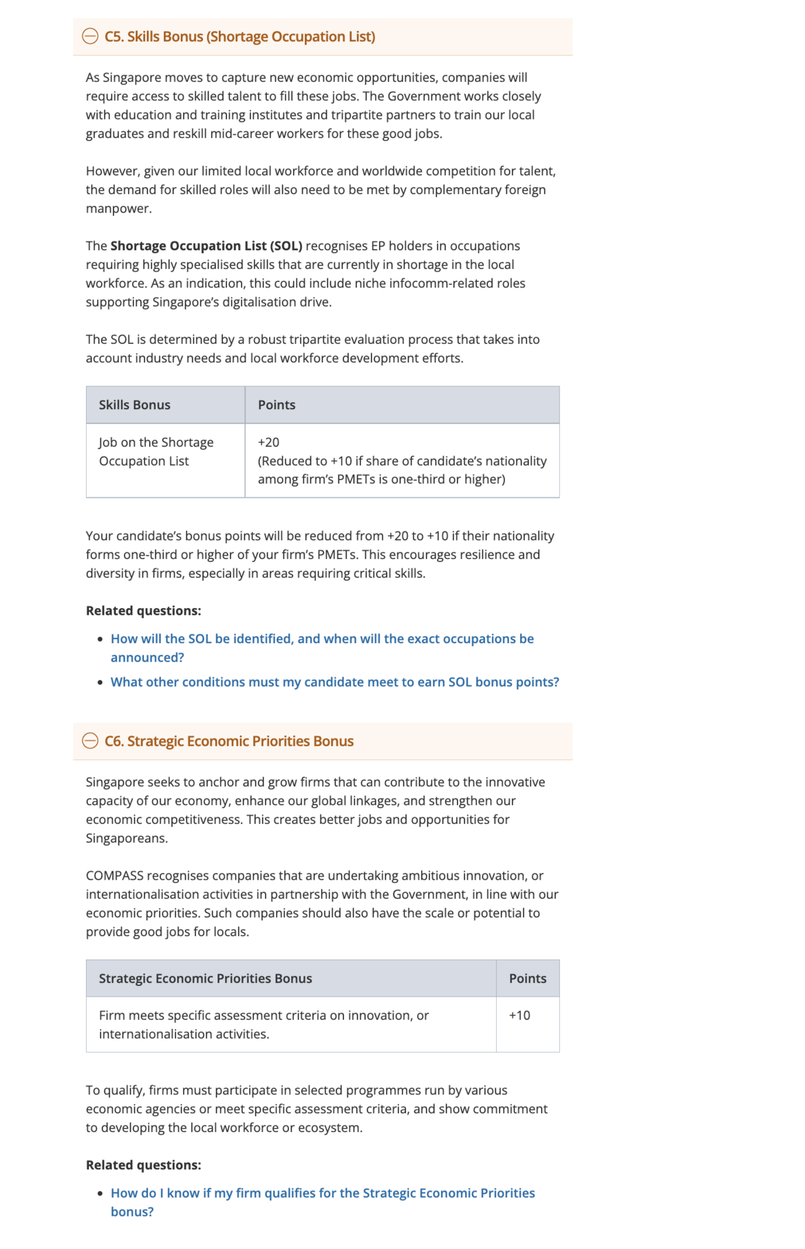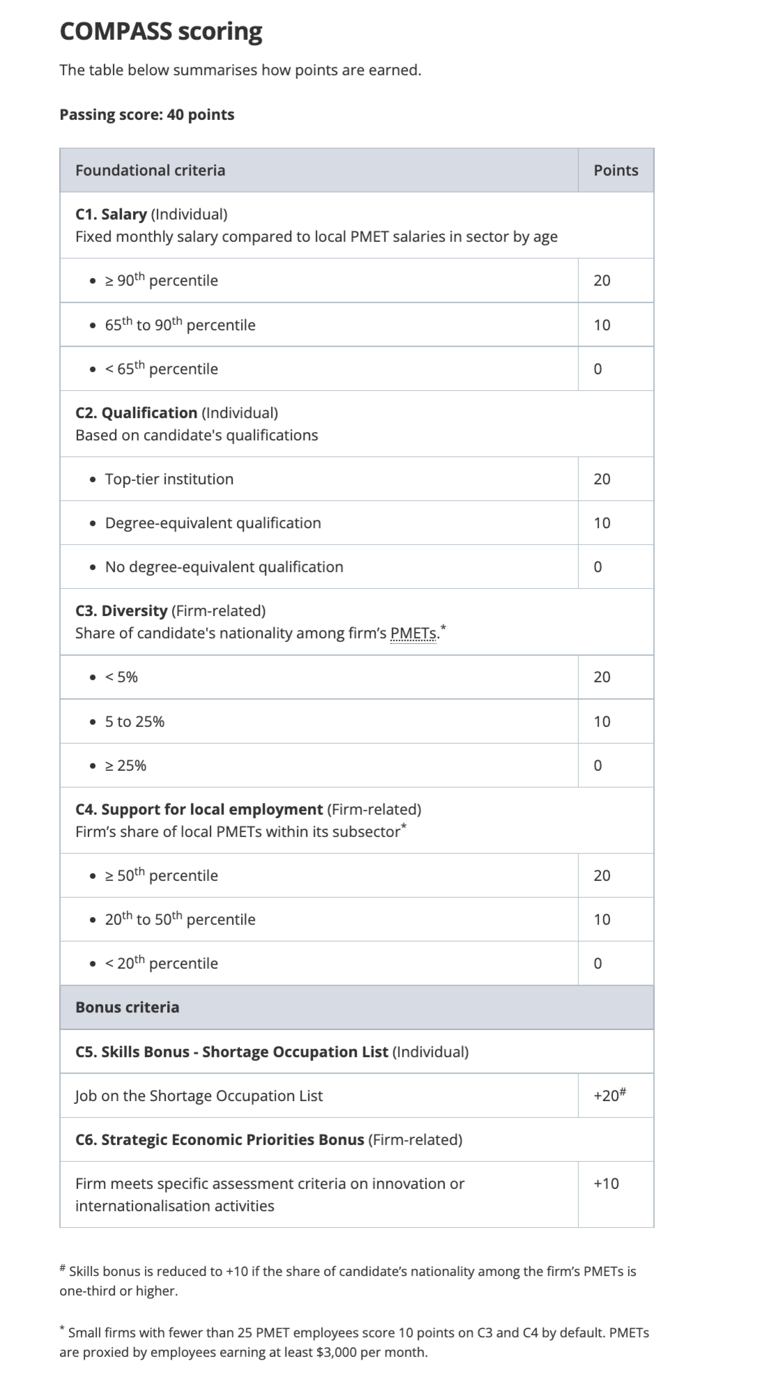Your application can also earn additional points on bonus criteria if it meets the relevant qualifying conditions. These criteria recognise applications that bring in skills in shortage and support strategic economic priorities, thus creating good jobs for Singaporeans.