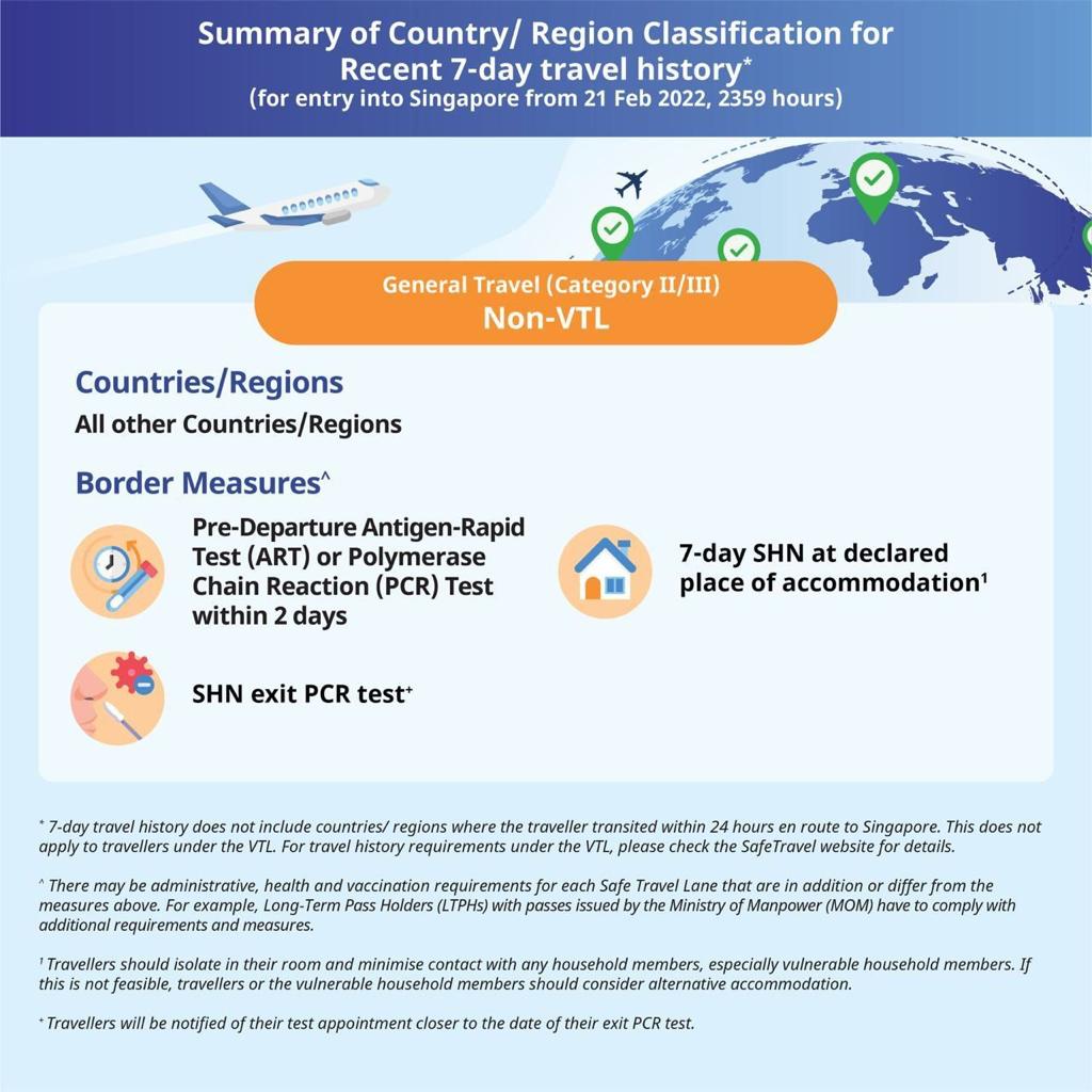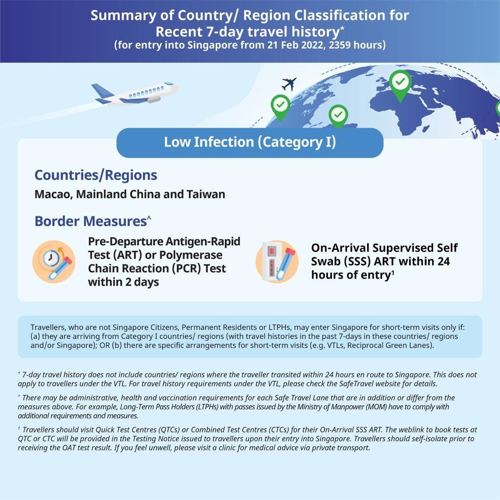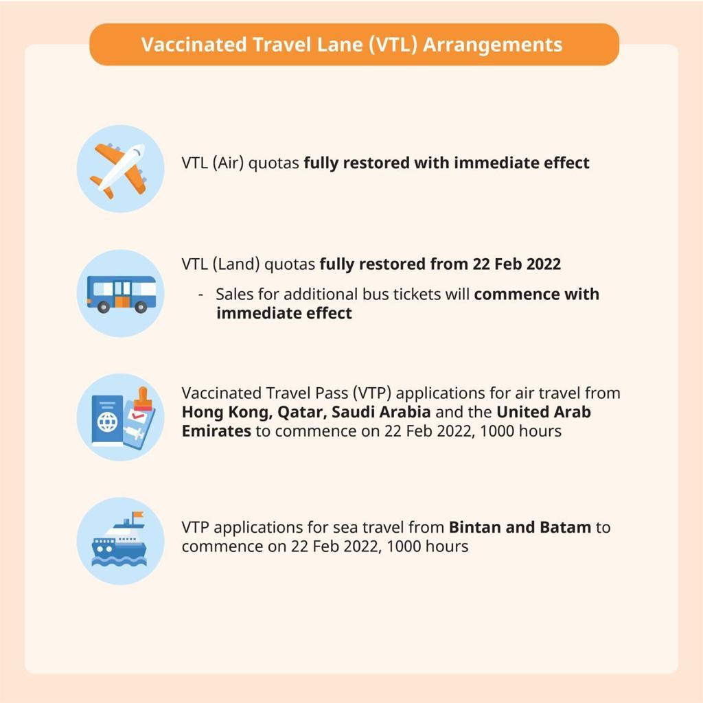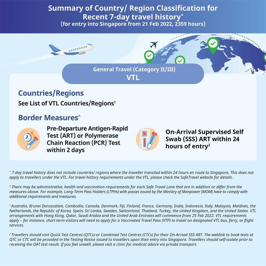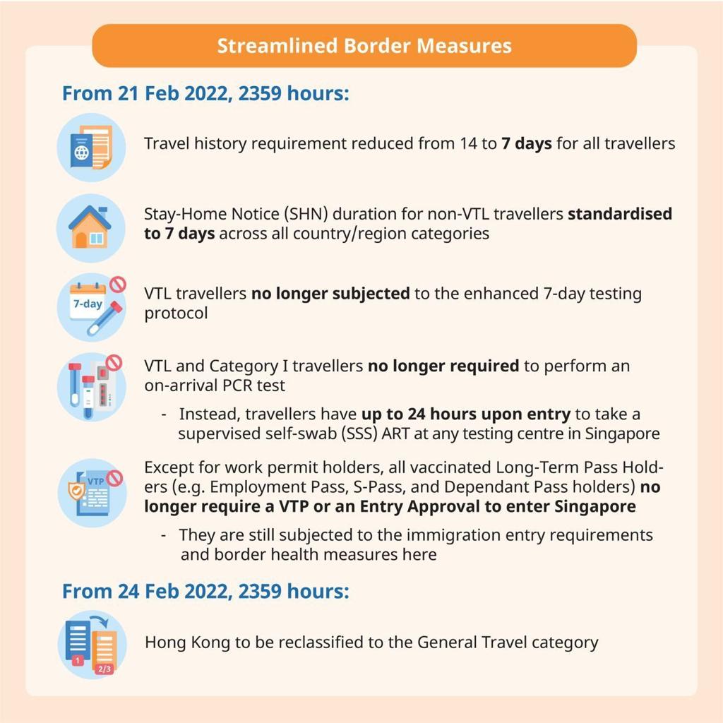 Singapore’s Multi-Ministry Taskforce (MTF) announced on 16 Feb 2022 that the Government is updating the country/region classification and the border measures, including the removal of entry approval or Vaccinated Travel Pass (VTP) for fully vaccinated Long-Term Pass Holders (except Work Permit Holders) from 22 February 2022.