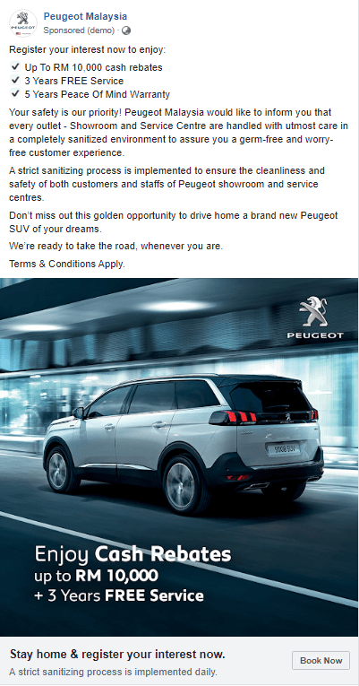 Peugeot Malaysia – Book a test drive for after MCO (pic below): Since users were not able to book test drives since they could not visit the showroom and may be concerned about health and sanitization issues. We adapted our copies to ensure that their safety is top priority and emphasized the sanitization process to mitigate the likelihood of spreading the virus. After we made the changes, we experienced a -46% decrease in Cost per Lead across the board between 2nd half of April and 1st half of May.