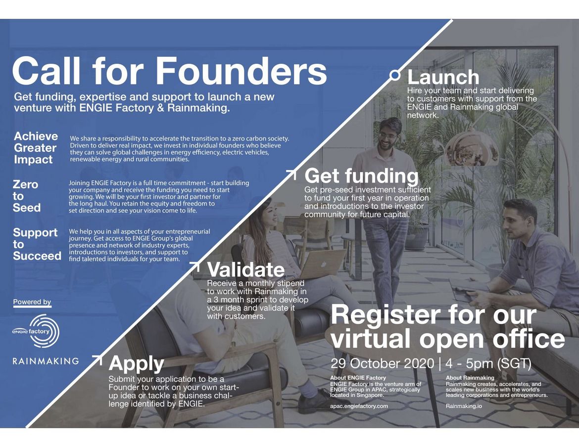 Submit your application to be a Founder to work on your own startup idea or tackle a business challenge identified by ENGIE.