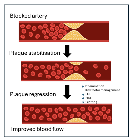 Early detection and quantifying an individual’s cardiovascular risk is just the beginning. What should we do once blockages are found? A common misconception is that blockages must have surgery or stents to treat, but this can’t be further from the truth. Some cases of severe blockages may indeed benefit from ballooning and stents inserted into the arteries to dilate the blood vessels (a procedure known as percutaneous coronary angioplasty, Fig. 1), other more severe or extensive disease may need coronary artery bypass grafting surgery. However, thankfully many blockages do not, and this applies even to seemingly tight blockages causing more than 70% narrowing, these can still be safely and effectively treated with a combination of therapeutic lifestyle interventions and medications. Heart blockages that are asymptomatic and/or have undergone special evaluations known as functional tests and passed, may be treated safely with a combination of medication and aggressive risk factor modification through lifestyle interventions. These key therapies reduce inflammation, decrease the likelihood of blood clots and improve vascular health and function. This strategy has been shown to stabilize blockages and even shrink them over time, thereby reducing the risk of developing heart attack and its complications in the future. This process of shrinking the cholesterol deposits (called atherosclerotic plaques) in the blood vessels that cause blockages is called “plaque regression” or “medical angioplasty” as opposed to the surgical methods mentioned above (Fig. 2).