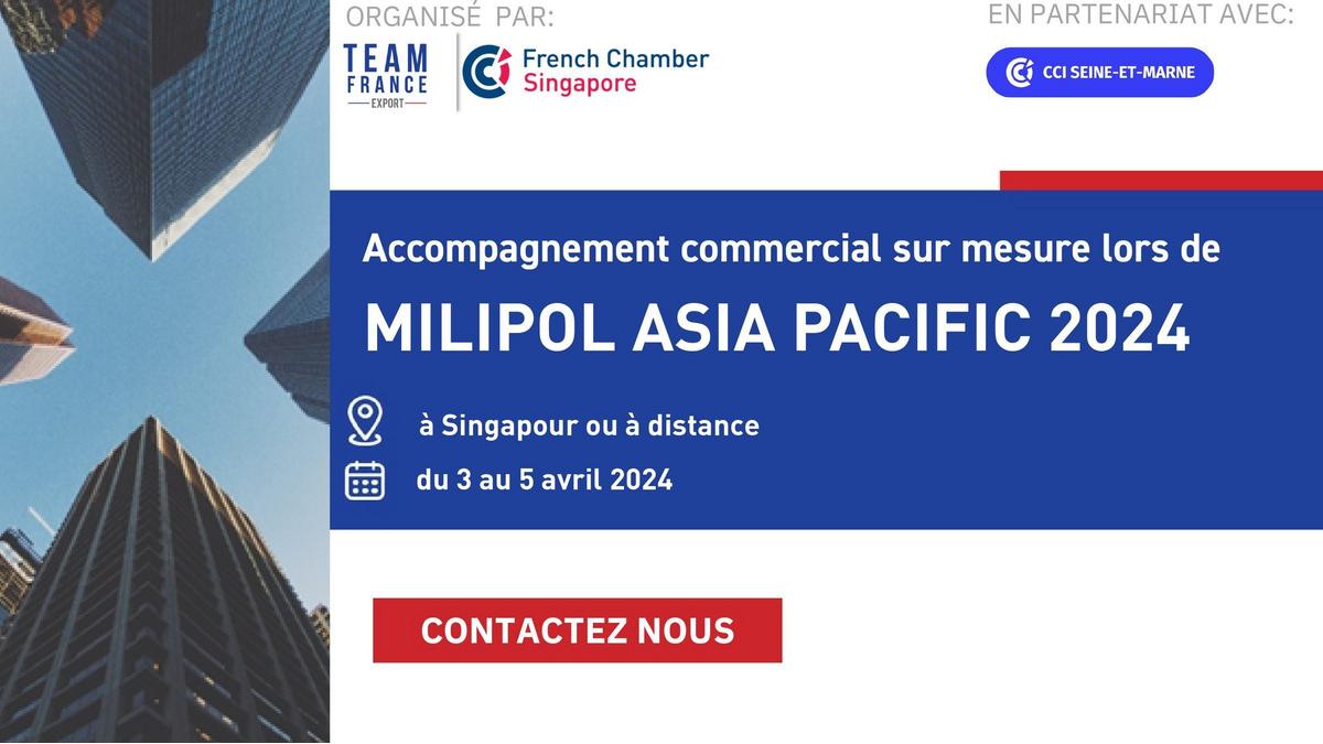 La Team France Export de la Chambre de Commerce de Singapour, en partenariat avec la CCI Seine-et-Marne, vous accompagne pendant Milipol Asia Pacific 2024 qui aura lieu du 3 au 5 avril 2024.