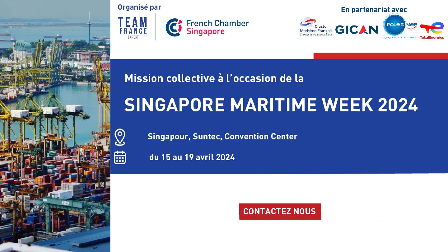 La Chambre de Commerce de Singapour, représentant de la Team France Export à Singapour, en partenariat avec le Cluster Maritime, le GICAN, le Pôle Mer et TotalEnergies, vous propose une mission collective à Singapour à l’occasion de la Maritime Week, qui aura lieu du 15 au 19 avril 2024 au Suntec Convention Centre.