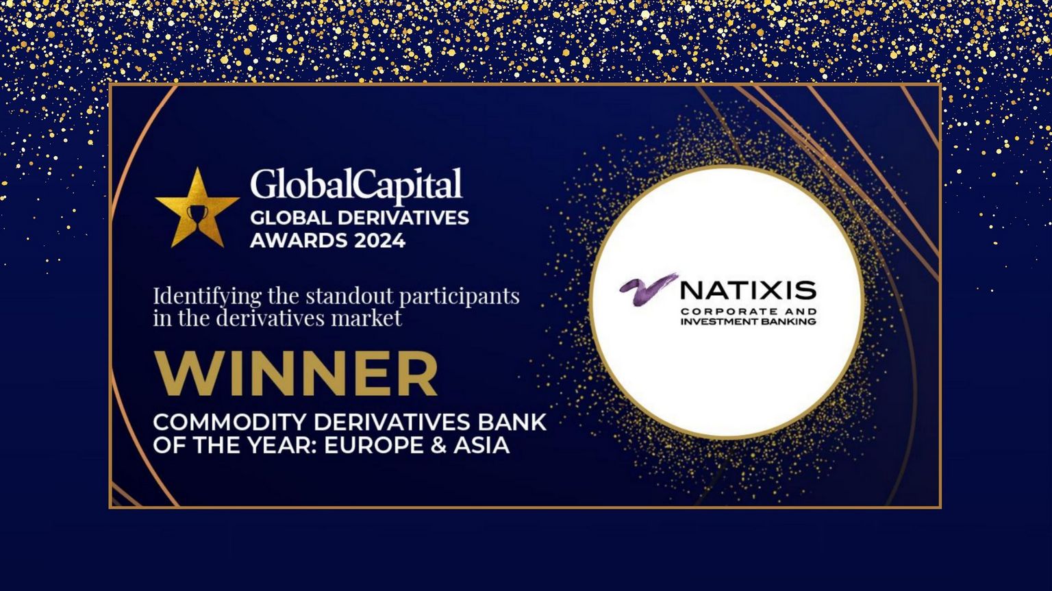 Natixis Corporate & Investment Banking announces its recognition as the Commodity Derivatives Bank of the Year for Europe and Asia at the GlobalCapital Derivatives Awards 2024.