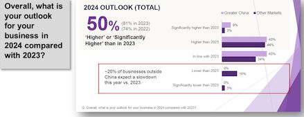 Despite all the headwinds, expectations about profits from China are in line with the past year, or towards growth, while approximately 20 percent expect businesses outside China to slowdown this year compared to 2023.