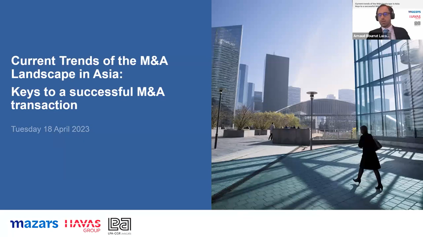 Thank you to our esteemed panelists - Mrs. Marie Mbaye, Head of Legal APAC at Havas, Mrs. Bérengère Roig, Partner at LPA Singapore, Mr. Nicolas Vanderchmitt, Partner at LPA-CGR avocats Hong-Kong, Mrs. Fanny Nguyen, Partner at LPA-CGR avocats Shanghai, Mr. Jean-Francois Salzmann, Managing Partner at Mazars in Japan, Mrs. Najla Belkhoja, Director at Mazars in Hong Kong, Mr. Laurent Nguyen, Partner at Mazars in Vietnam, Mr. Hong Chuan Goh, Director at Mazars in Singapore, Mrs. Cindy Cheung, Partner at Mazars in China (Shanghai) for leading a very insightful discussion on M&A trend landscape in Asia.