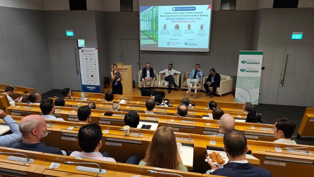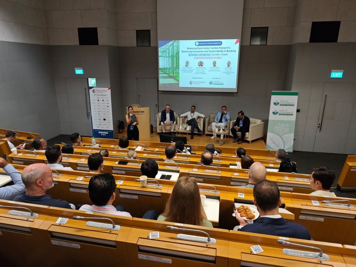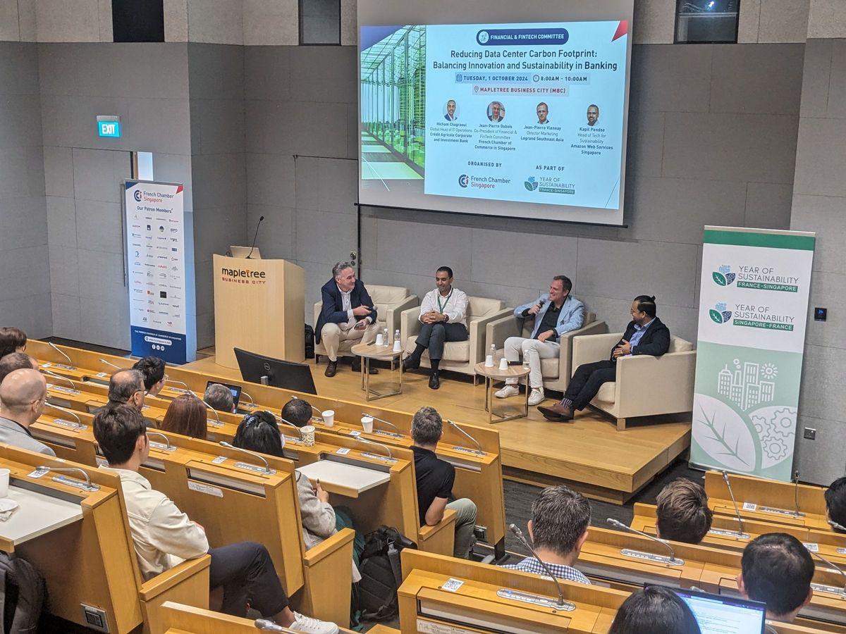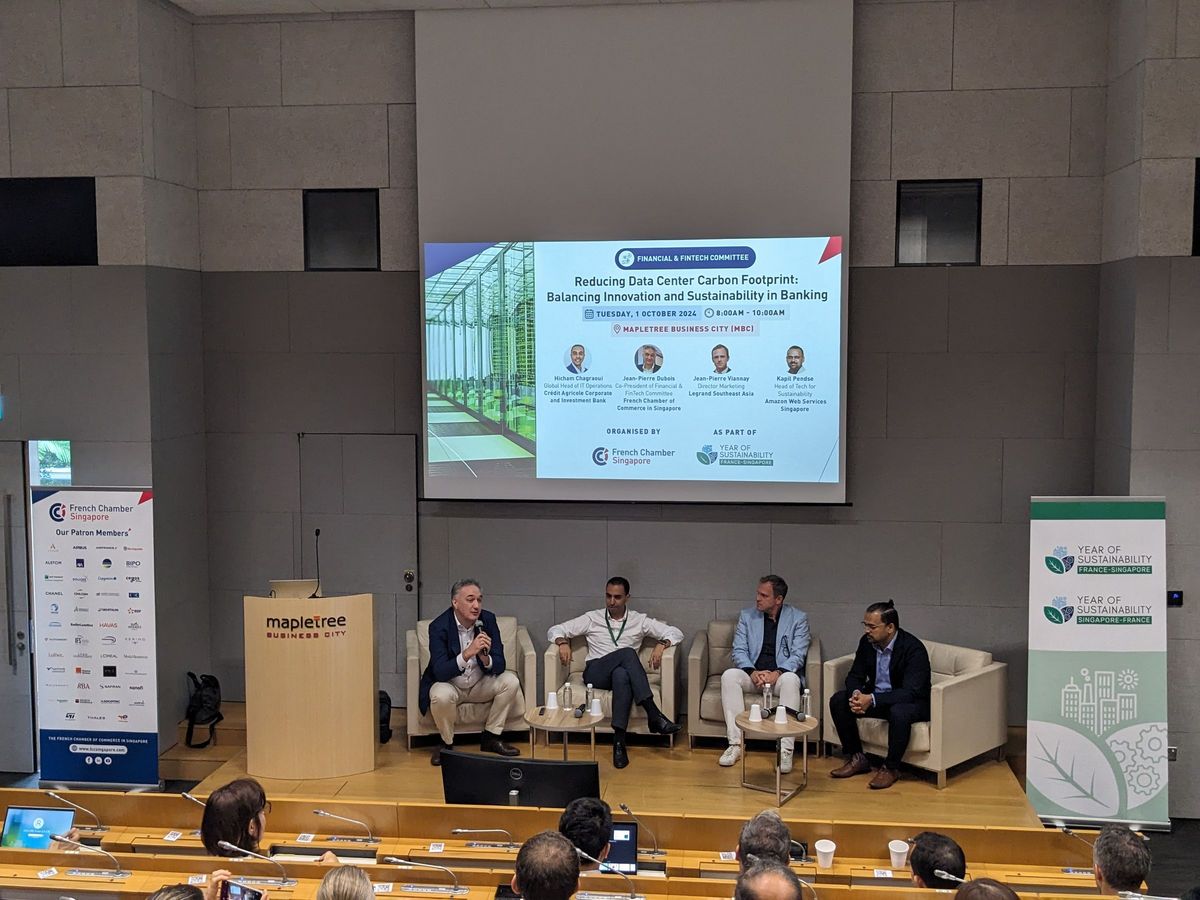 Thank you to our esteemed speakers Hicham Chagraoui, Global Head of IT Operations at Crédit Agricole Corporate and Investment Bank,Kapil Pendse, Head of Technology for Sustainability at Amazon Web Services Singapore, Jean-Pierre Viannay, Directeur Marketing at Legrand Southeast Asia and to Jean-Pierre Dubois, Co-President of Financial & FinTech Committee at French Chamber of Commerce in Singapore for facilitating this panel discussion that explored ways to reduce data center carbon footprint in the banking industry.
