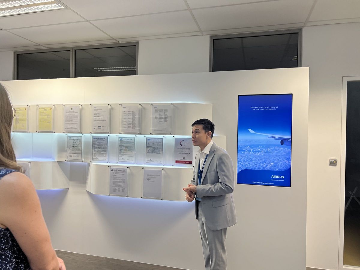 The visit began with a great briefing by Mr. Thomas Cochelin, co-president of the Aeronautic, Space, Defence and Security Committee at FCCS and Head of Procurement Asia Pacific at Airbus on its history, activities in Asia Pacific and its sustainability journey. Our members then went to the AATC where Mr. Zakir Hamid and his team showcased the training classrooms, the Full Flight Simulator (FFS) Bay featuring 10 of their FFS, and their state-of-the-art A350/A380 cockpit.