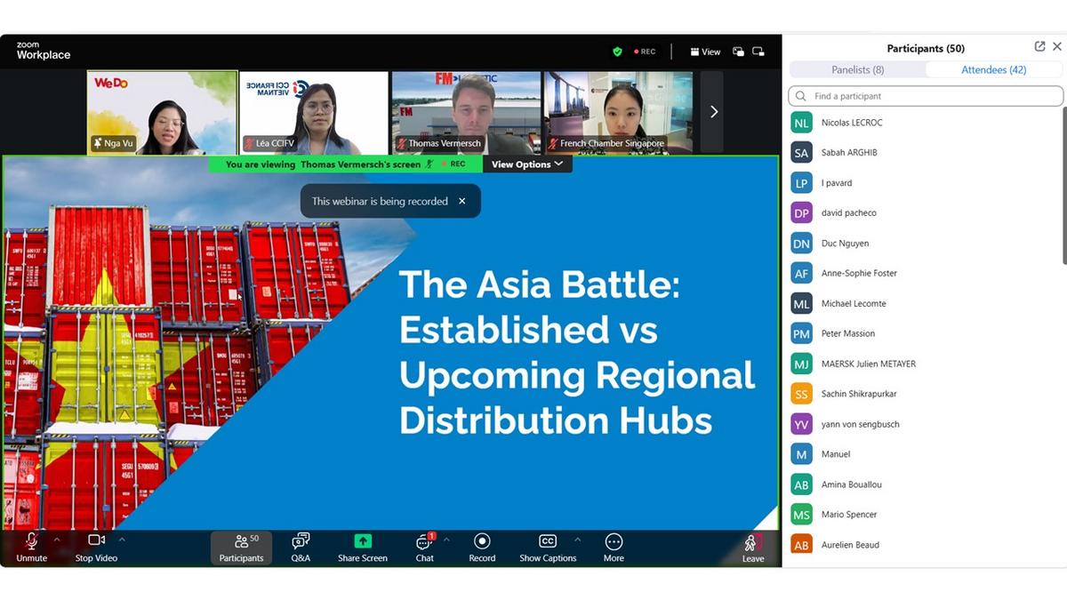 The French Chambers of Commerce in Singapore, Hong Kong and Vietnam co-organised a webinar on "The Asia Battle: Established vs Upcoming Regional Distribution Hubs" on 25 April.