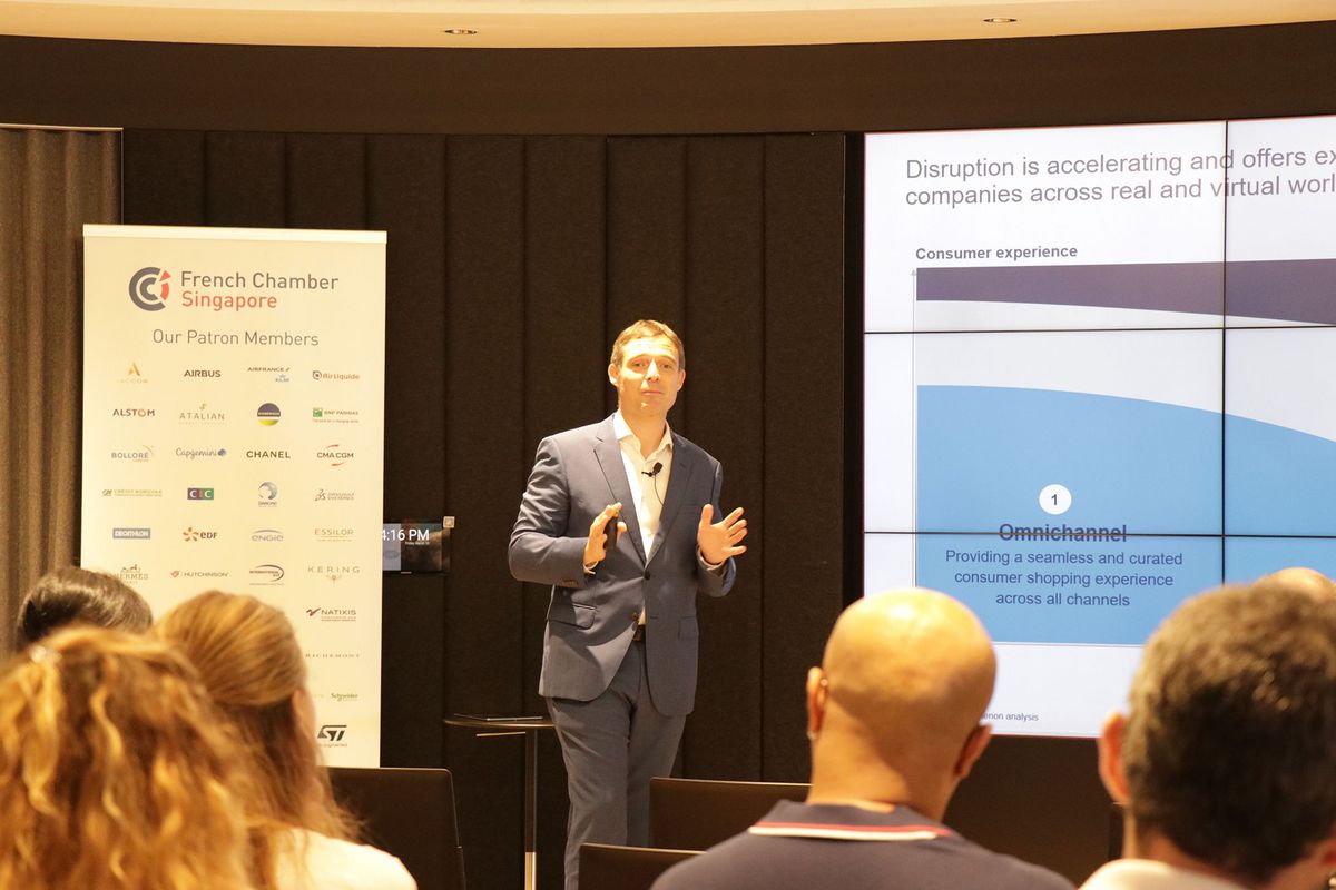 The French Chamber of Commerce in Singapore along with Les Conseillers du Commerce Extérieur (CCE) and in partnership with the Economic Development Board (EDB) in Singapore organised an exclusive panel discussion around the e-commerce landscape in ASEAN with Olivier Gergele, EY-Parthenon Partner, APAC Consumer Goods & Retail leader, Brigitte Daubry - Group Chief Customer Officer, Lazada- Alibaba Group, Brandon Chia - Regional Director (designate) Brand, Marketing and Communications at EDB, Gildas Chambrelan – VIP International Sourcing at Redmart, Loïc Rigaud - Asia Sales Director at Lyreco and Joris Bernard, Managing Director Southern Asia Savencia F&D.