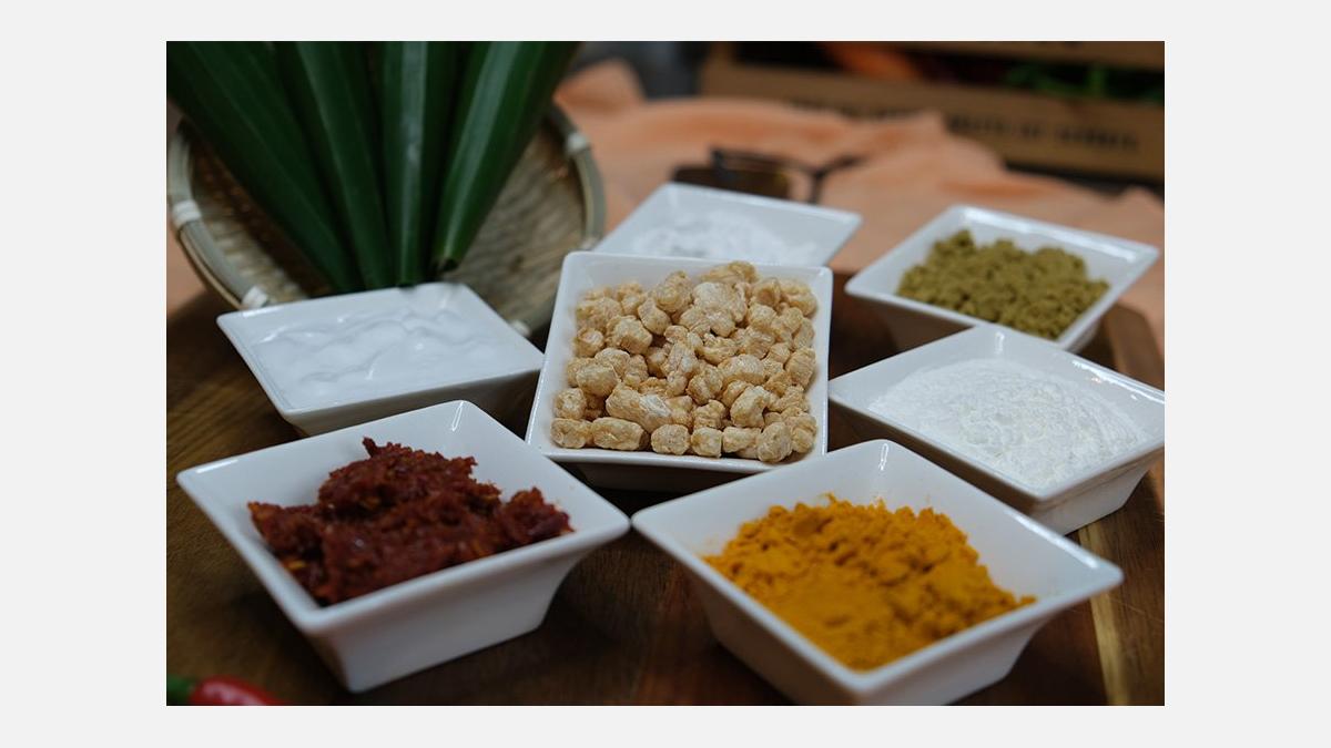 Examples of local dishes created using plant protein from Roquette: scroll to see the ingredients used, including the main ingredient of texturized pea protein (center). (Images courtesy of Roquette Asia Pacific Pte Ltd)