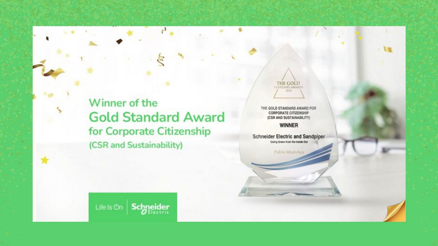 Schneider Electric and Sandpiper have been awarded the prestigious Gold Standard Award 2024 for Corporate Citizenship (CSR and Sustainability) by PublicAffairsAsia and PRCA APAC. Their "Going Green from the Inside Out" initiative, which underscores a profound commitment to corporate sustainability, has been recognized for its long-lasting impact on environmental responsibility.