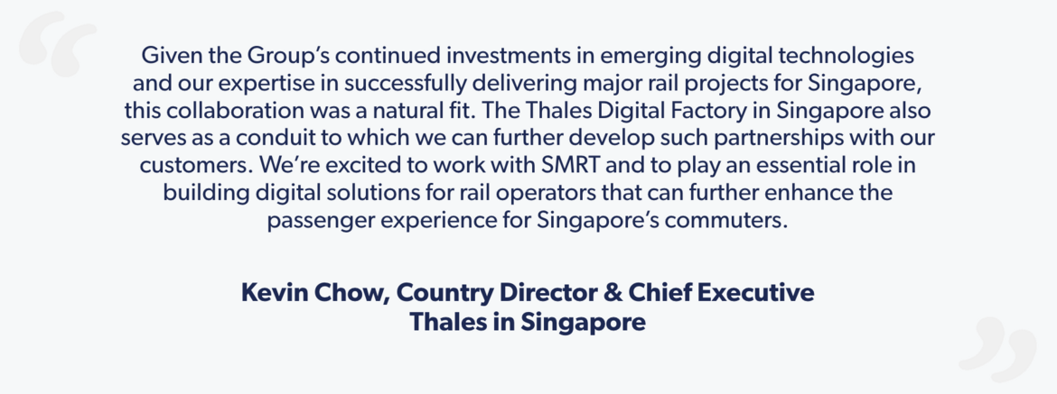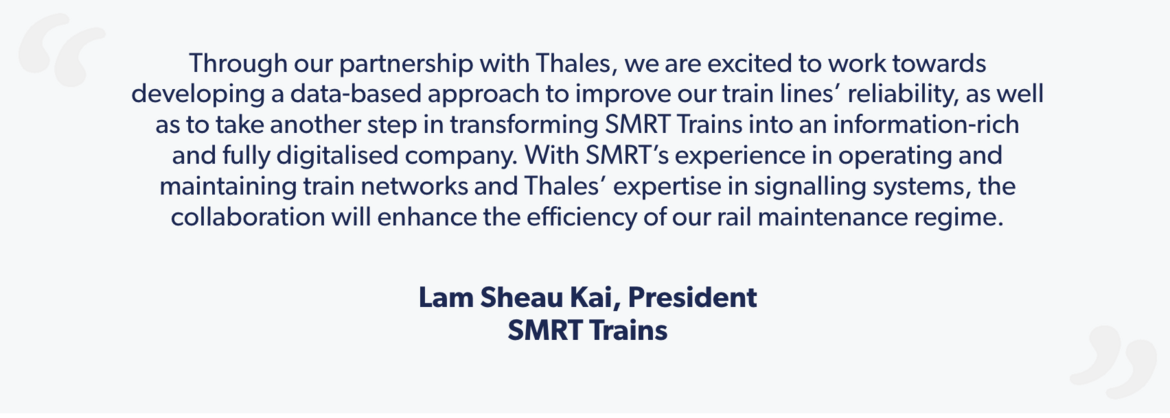 To ensure that the collaboration remains focused on real challenges and pain points of the end-user, the SMRT engineering teams will bring common problem statements to be addressed from a rail operator’s perspective, which both teams can work on. Thales brings its expertise as a technology partner with its in-depth knowledge in Communications-Based Train Control (CBTC) signalling and rail control systems, and best practices in data analytics technologies.