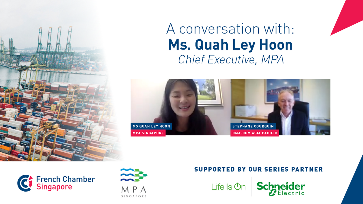 Ms. Quah Ley Hoon, Chief Executive at Maritime and Port Authority of Singapore (MPA,) shared about the company's strategy, discuss about the Maritime And Port activities including digitalisation and decarbonisation initiatives, as well as MPA's new Tuas port. The dialogue was moderated by Mr. Stephane Courquin, Chief Executive Officer at CMA CGM Asia Pacific and Board Member at the French Chamber of Commerce, followed by closing remarks by His Excellency HE Mr Marc Abensour, Ambassador of France to Singapore.