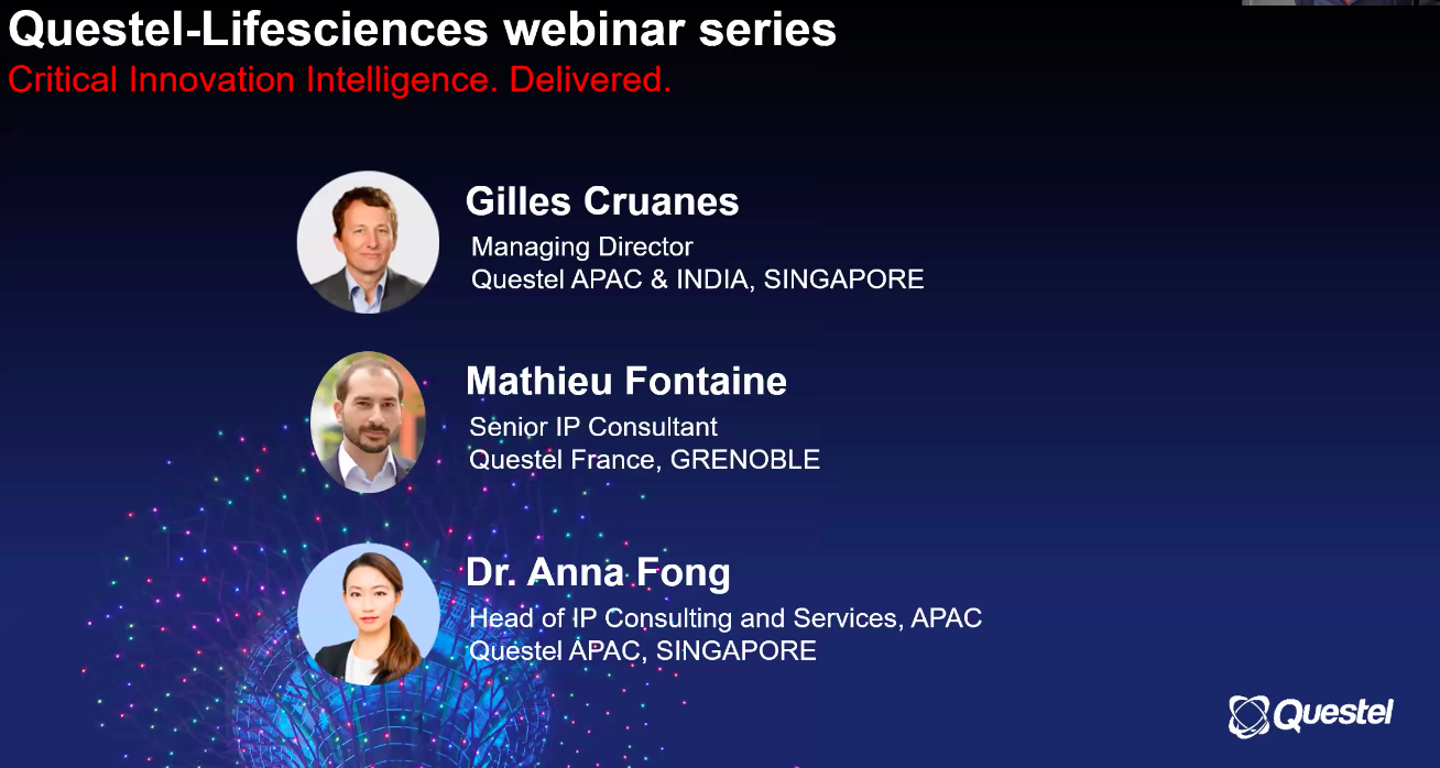 During this webinar, speakers Gilles Cruanes, Managing Director, Mathieu Fontaine, senior IP consultant, and Anna Fong, Head of IP Consulting and Services, from Questel shared practical example on how technology landscaping and technology scouting could help organisations better collaborate with other biopharma companies, smaller biotech companies, research laboratories, and academic institutions across the globe.