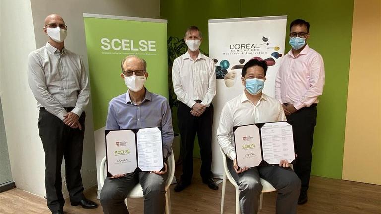 Launching this joint lab between L’Oréal and SCELSE are (seated L-R): Staffan KJELLEBERG, SCELSE Centre Dir & Research Dir (Biofilm Biology); Mark…